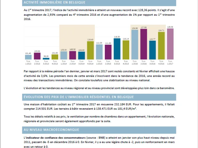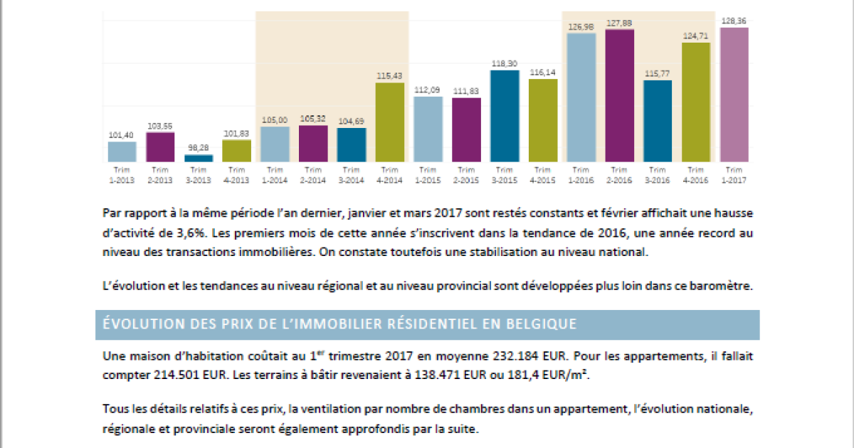 Au 1er trimestre 2017, le nombre de transactions immobilières a augmenté de +2,93% par rapport au 4e trimestre 2016. L’indice immobilier belge atteignait ainsi 128,36 points lors du trimestre écoulé, un nouveau record depuis la première publication de ce baromètre (1er trimestre 2009). Ce résultat s’explique par le marché immobilier flamand, pour lequel on enregistre une hausse de +4,51% du nombre de transactions. A France et en Wallonie, il s’agit davantage de stabilisation que d’activité : -0,66% et +0,56%.