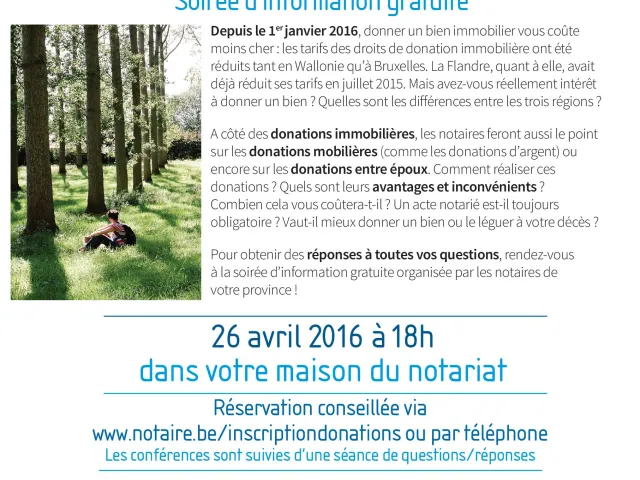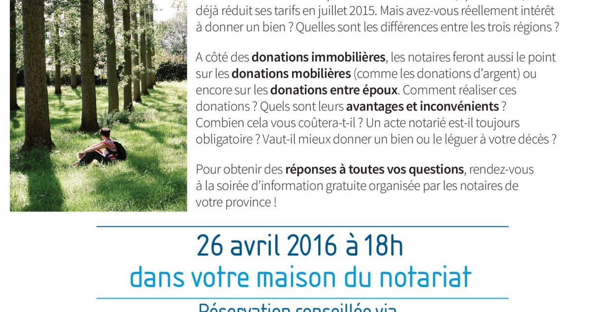 Pour obtenir des réponses à toutes vos questions, rendez-vous le mardi 26 avril 2016 à 18h dans la maison des notaires de votre province !