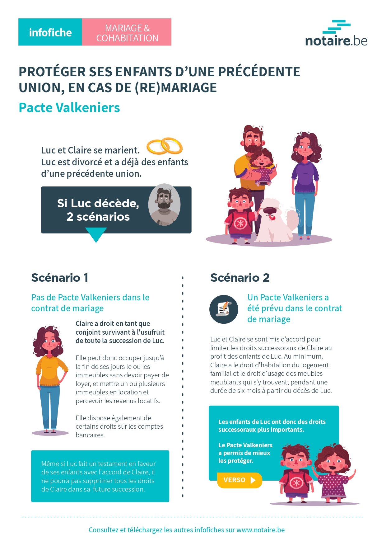 Pour y remédier, vous pouvez conclure un accord avec votre conjoint qui limite la part de l’autre appelé « pacte Valkeniers ». Ainsi, vous pouvez modifier le droit d’usufruit dont votre conjoint aurait normalement hérité en faveur des enfants d'une relation antérieure.
