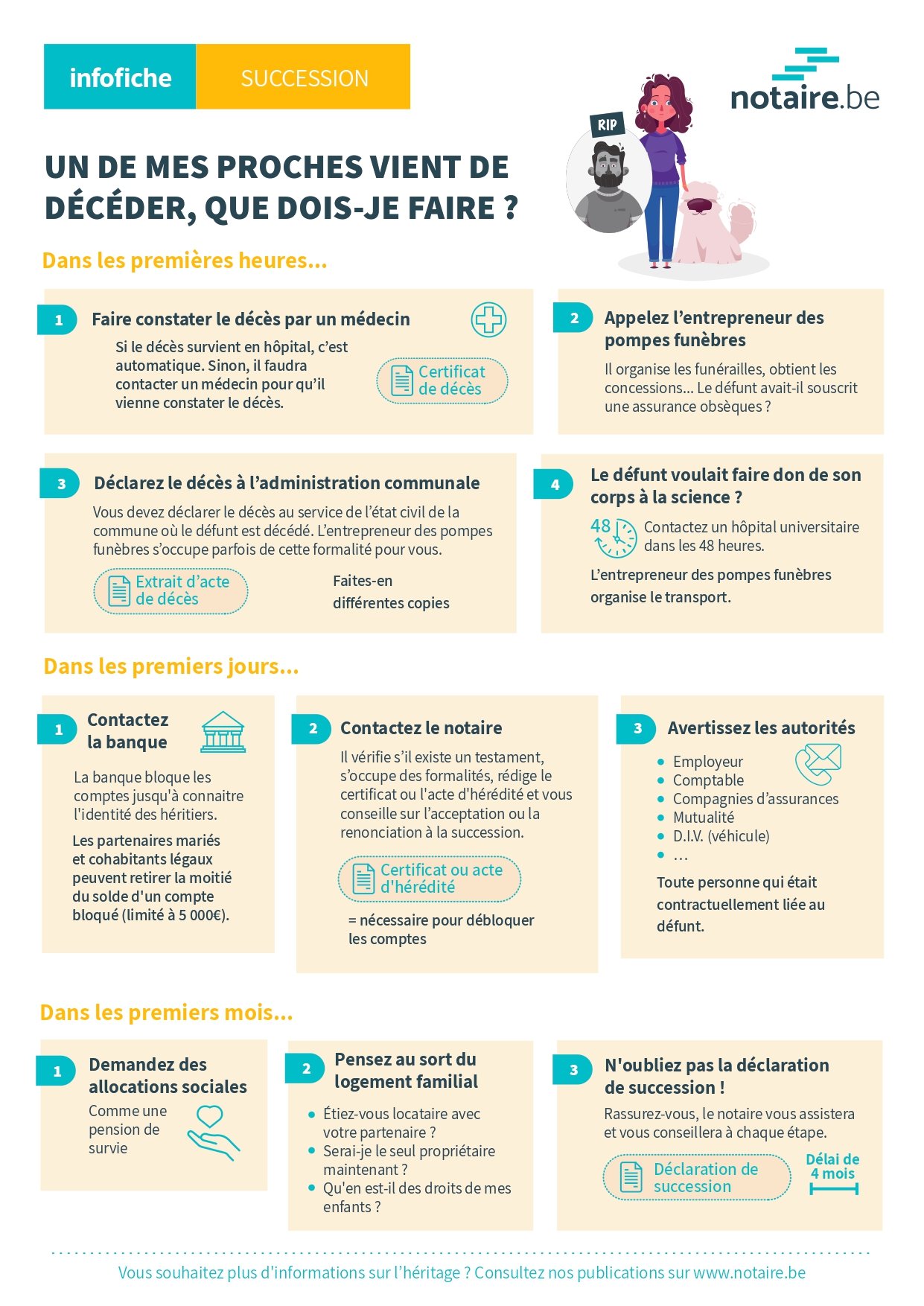 La perte d’un être cher est toujours bouleversant. À cela s’ajoutent, malheureusement, de nombreuses formalités pratiques et administratives. Par où commencer ? Qui devez-vous contacter ? Quelles sont les démarches à effectuer ? Quel est être le rôle du notaire ? Notaire-Cabinet vous guide étape par étape.