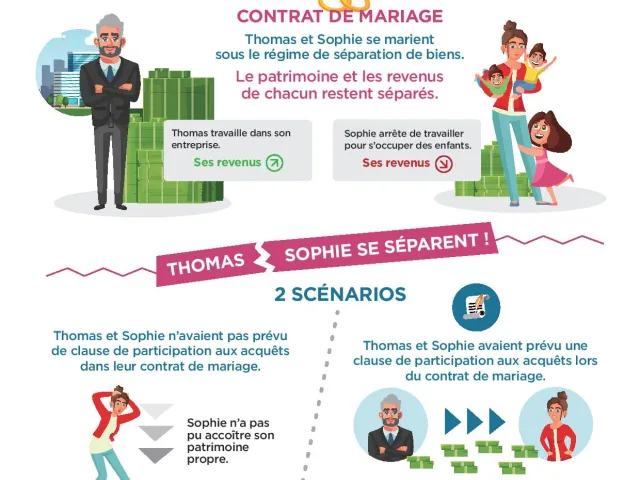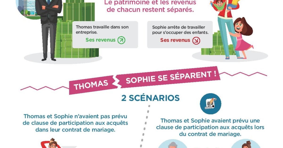 Prenons l'exemple suivant : Thomas et Sophie se sont mariés sous le régime de la séparation de biens . Ils ont eu trois enfants. Sophie a décidé d’arrêter de travailler pour s’occuper de leurs enfants. Thomas gère son entreprise et gagne bien sa vie, ce qui permet de subvenir aux besoins du ménage. Thomas et Sophie se séparent. Or, les revenus des époux étant séparés (régime de séparation de biens), Sophie risque de se retrouver sans rien (ne travaillant plus, elle ne perçoit plus de revenus propres). Solution : insérer une clause dans leur contrat de mariage, afin de garantir une certaine solidarité en cas de séparation ou de décès et protéger ainsi le conjoint économiquement plus faible (ici, Sophie). La clause de participation aux acquêts est une solution à cet égard.