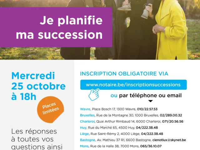 , donations, ...). Les notaires y aborderont également la réforme successorale : ils épingleront les principaux changements qui impacteront votre succession.
