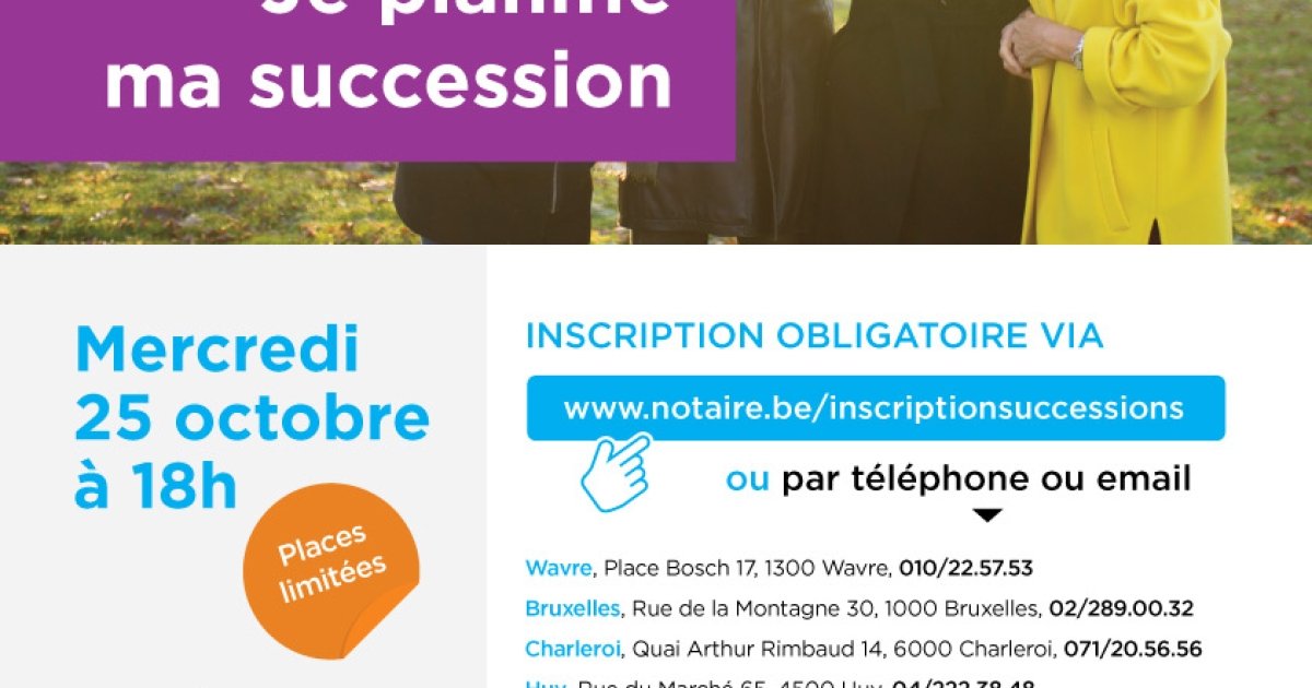 Rendez-vous à la soirée d’information gratuite organisée par les notaires de votre province à 18h dans les maisons du notariat (adresses ci-dessous). Vous y obtiendrez les réponses à toutes vos questions, ainsi qu’une foule de conseils pour organiser la transmission de votre